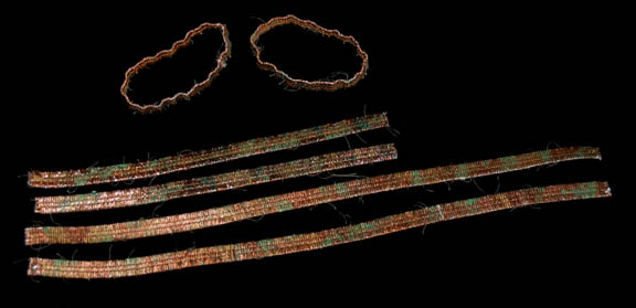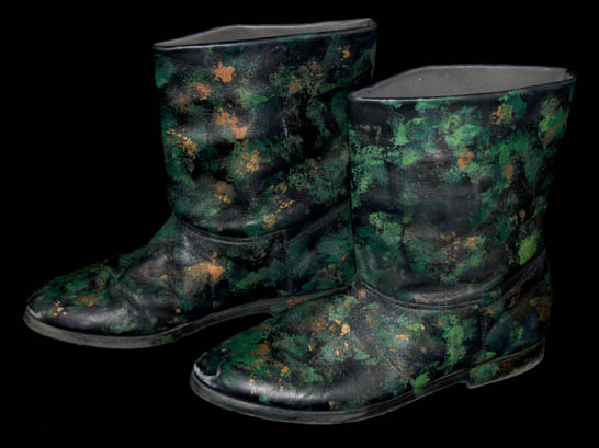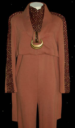 Description: An excellent Next Generation era ‘Ferengi' costume featured in episodes during seasons 2 through 7 and specifically in the episode “Bloodlines”. This soft, milk chocolate colored jumpsuit comes with a corresponding cropped top with long sleeves that feature gold and brown mesh on the outside of the sleeves, and a matching collar and inside ‘shirt’ for wear underneath. The top also features a set of rings in the center of the chest, an accent familiar to Ferengi costumes. A pair of gold colored bracelets are present and a pair of black leather boots with painted green and gold blotches are included. The sewn in Next Generation tags indicate wear by multiple actors and the lot comes with a costumer’s tag.