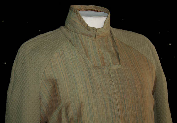 Description: A pair of character costumes featured in the Star Trek: Deep Space Nine episode “Invasive Procedures”. Worn by “Smallville” star John Glover during his portrayal of “Varad” whose band of terrorists took over “Deep Space Nine” and stole the “Dax” symbiont from “Jadzia” (Terry Farrel), this costume is made up of green lined pants and a matching costume top with quilted diamond pattern sleeves, and a corresponding detached interior collar. The costumes are almost identical; one was made for a photo double. Both costumes feature sewn in The Next Generation tags, one costume top with ‘J. Glover' inscribed on the tag, both feature costumer’s tags.