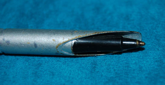 Description: A metallic silver painted prop pen featured in the Star Trek: Deep Space Nine episode “Children of Time” wherein the crew of the “USS Defiant” become predestined to crash on the planet they are orbiting and eventually spawn multiple generations worth of their descendants 200 years in the past. Before this occurs, the away team discovers the fact by meeting some of their great-grandchildren and more. One of the children in the colony, now 8000 strong, was drawing as part of her homework while determining a math problem given to her by the “Quark” (Armin Shimerman) computer program teacher. This item is the child's pen, a metallic silver painted pen with gold colored metallic adhesive tape accents. The interior ballpoint pen can actually be made to write, though it should be taken into consideration the time of storage since the episode. The pen writes in black ink and measures approx. 6 inches in length.
