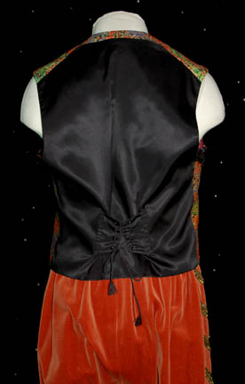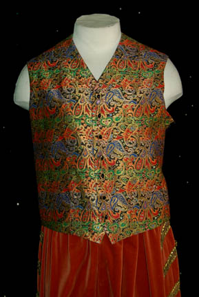 Description: “Data” (Brent Spiner) was the beloved Soong-type android from the Star Trek: The Next Generation series. As the one and only android being to enter Starfleet, Data strove to learn as much as possible about what it means to be human. This is one of his costumes worn during one of The Next Generation episodes and includes auburn velvet pants with gold and black trim up each side. The pants snap at the front and have a laced waist. The accompanying ornate waistcoat is an elaborate multicolored Paisley design with black and gold buttons and a black back. The inside of both items read “Brent”. The costume comes complete with costume tags.