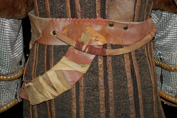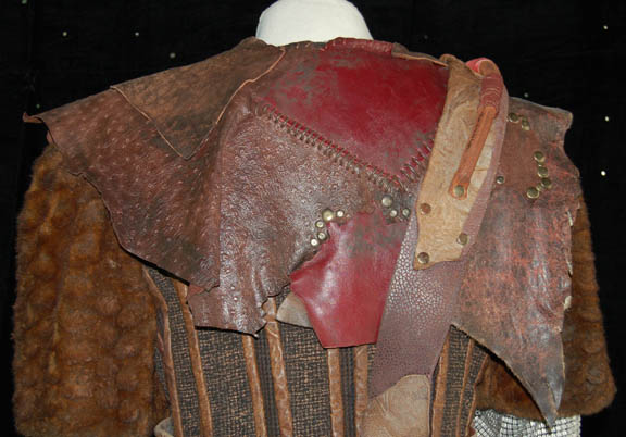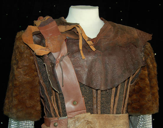 Description: This imposing Klingon costume was worn by various actors during the Star Trek: Enterprise series. The coat is made of pleated woven brown and tan fabric with brown leather trim. An assortment of leather pieces and brass fasteners has been attached to the shoulders for detail. The sleeves are made from a combination of faux fur and chain-mail at the bottom. Brass colored metal rings have been added around the chain-mail for decoration. The harness is made from an amalgamation of leather pieces over a fabric frame complete with leather rope style details and leather stitching. The outfit is complete with chocolate brown color pants that have pleats down the front and back and stirrups at the feet. There is a small hole in the crotch along the seam and slight distress in the back. The sewn in tag indicts that this item was worn on Star Trek Enterprise by at least four different actors including Vince Deadrick.