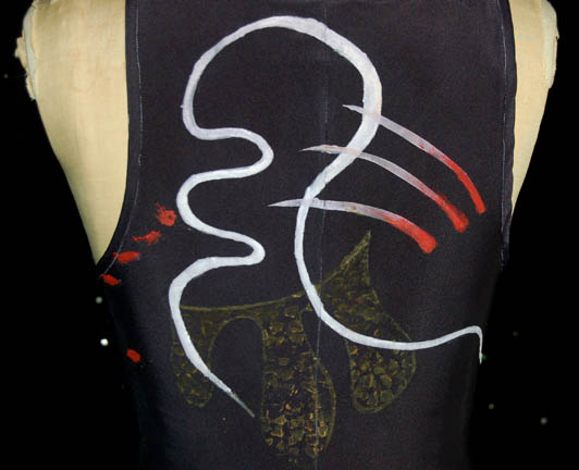 Description: A costume featured in the Star Trek: Voyager episode “The Thaw” wherein “Voyager” crewmembers are trapped in a nightmarish reality and encounter “The Clown” (Michael McKEan) who at one point threatens to execute them. The “Executioner” was played by Henry Reichenbach as described by the costumer's tag and his costume was this black full length leotard with painted on circus –like accents and a set of arm bands and a belt with attached metal stud details.