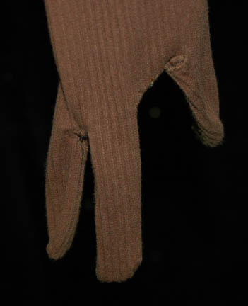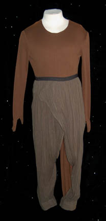 Description: “Jakin” (Bill Mondy) was a captain of the T'Lani fleet during the Deep Space Nine episode “Armageddon Game”. This is his scientist costume and includes a long sleeve brown ribbed jumpsuit with the thumbs, ring and pinky fingers built in. The flowing gray/green pants are crimped with cuffs at the ankles. Worn over the jumpsuit and pants is a long sleeve top made of neoprene covered with olive green fabric. The top is slit into two sections held as one by a central strip down the front and back. Costume comes complete with costume tag.