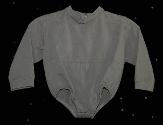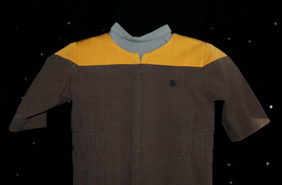 Description: This adorable infant Starfleet jumpsuit was worn by an infant “Harry Kim” (Taylor Chong) after the adult “Harry Kim” (Garrett Wang) was turned into a baby in an artificial reality created by the Kohl during the Star Trek: Voyager episode “The Thaw”. The little jumpsuit is black with operations gold shoulders, a zip at the front, snaps up the inner legs and built-in feet. There is a small Velcro patch for a combadge to attach (Combadge sold separately). There is slight light fading to the left sleeve due to storage conditions. A gray long sleeve undershirt accompanies the jumpsuit that snaps underneath. A small rank pip is also included, designed to stick onto the shirt at the collar. Costume comes complete with costume tag.