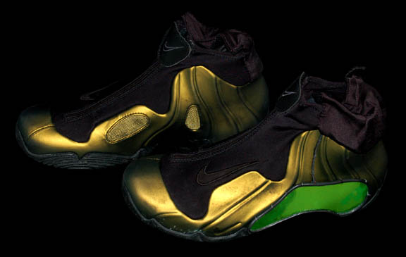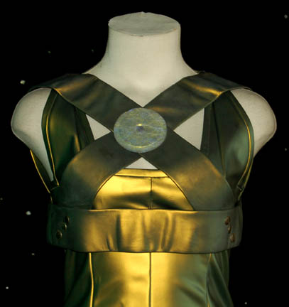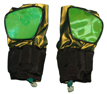 Description: The “Hirogen Fighters” was the name given to the Hirogen combatants forced to take part in the deadly sport called Tsunkatse as seen in the Star Trek: Voyager episode of the same name. This costume is made up of a metallic green vinyl jumpsuit with a matching harness; a pair of fingerless gloves with black nylon wrists and a green colored back of the hand (the polaron disruptors). One glove still has some of its original battery power left, the other does not. They appear to run on AAA batteries. The matching boots also appear to have had light up capabilities at some point however part of the electronics is missing on one boot and the other may need new batteries. That said, the costume still looks good even without the light up features!