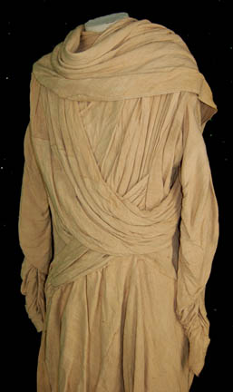 Description: This costume was worn by a monk in the Star Trek: Voyager episode “Sacred Ground”. The flowing robe is made of a tan fabric that wraps around the body and zips up the back. Costume comes complete with costume tag.
