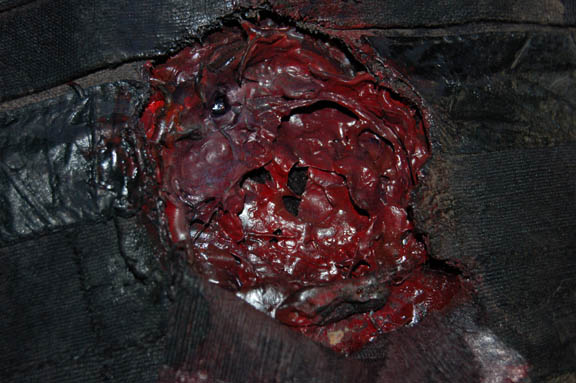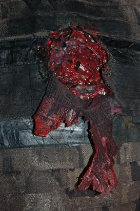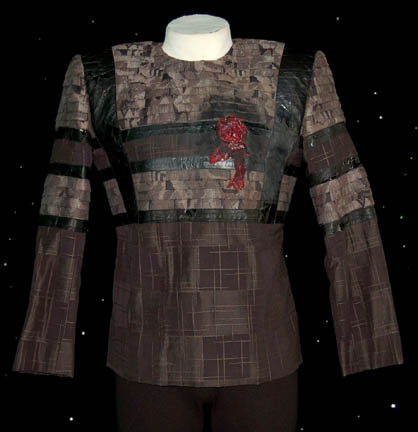 Description: A costume featured in the Star Trek: Voyager episode “Warlord” where in the body of “Kes” (Jennifer Lien) is taken control of by an alien named “Tieran” who uses her telepathic powers to take over his home planet's government. When “Voyager” responds to a distress call the crew of a damaged ship is taken on board. The costume is made up of a full length black jumpsuit with an ornate black and gray square-patterned fabric jacket that features a set of black leather accents and pleated fabric layers. The chest depicts a severe wound with dried special effects ‘blood’ and a costumer’s tag inscribed ‘Ron McCoy, dead Tieran’. The costume also comes with a selection of fabric scraps matching the costume.
