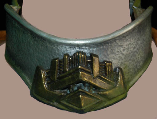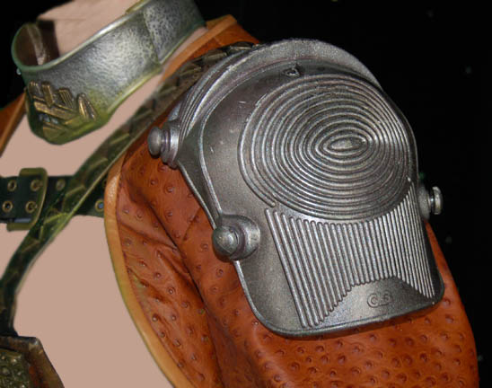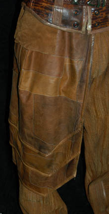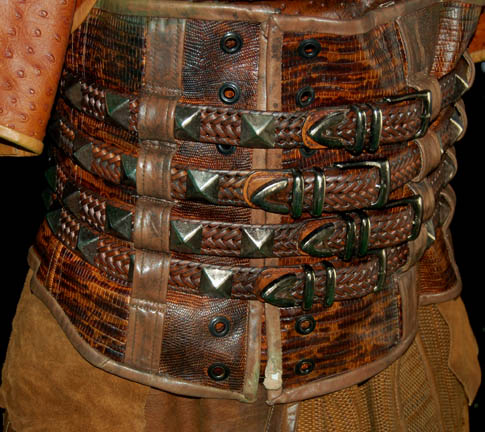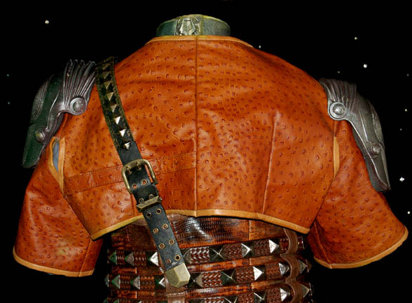 Description: The Orions are a humanoid species with distinct green skin from the Orion planet. This elaborate uniform was worn by an Orion guard in the Star Trek: Enterprise episode “Borderland. It features incredible pants made of woven leather strips with leather trim and a built in codpiece. Three tiered patchwork leather decorates the right side of the pants. There is a zip up the back and stirrups at the feet. Worn around the waist is a remarkable oversized cumber-band made of leather with embossed reptile print. Four leather lattice style belts with metal pyramid shaped studs thread through the band and buckle at the front. An addition leather shoulder strap with brass colored studs and detail is also attached. A loose piece of leather is attached and hangs at the back. The outfit is complete with a cropped shoulder armor top made of studded leather with leather trim. It buckles across the chest and has sprayed silver rubber and foam shoulder armor on the right side. There is also matching shoulder armor for the left side (included) that needs to be reattached. The inside tags indicate wear by various actors.