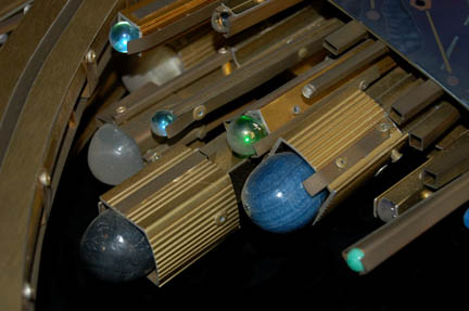 Description: This dynamic piece was used as set dressing during the filming of Star Trek episodic television. The body of the piece is purple mottled metal with gold, purple and blue inlaid shapes. Gold colored metal springs from the top, some of which have beautiful colored glass marbles and polished rocks attached at the pinnacle. This is a great piece to enhance any home or office space. Measures approx. 33 x 13 ½ x 3 ½ inches.