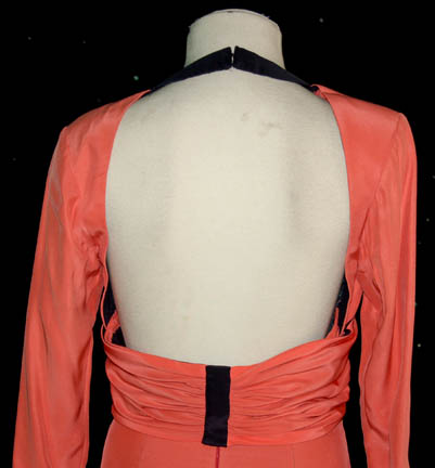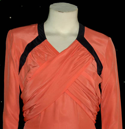 Description: Featured in the Star Trek: Voyager episode “Fortunate Son”, this long sleeved peach dress has a cross over pleated style on the chest and black trim. A sexy split up the front reveals the chic black lining. Costume comes complete with costume tag that indicates wear by “Rainelle Saunders”.