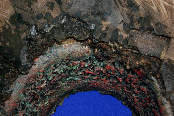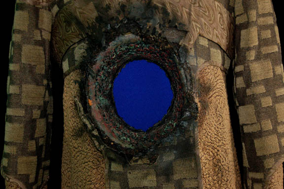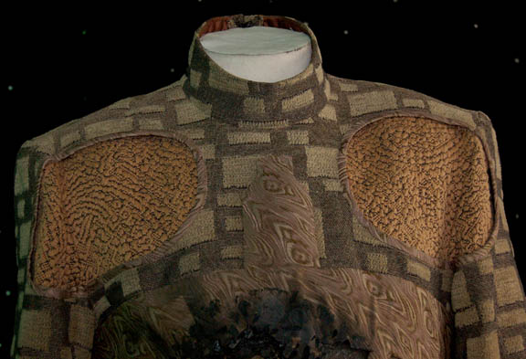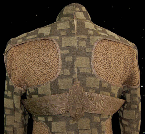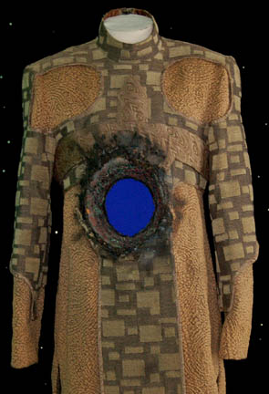 Description: “Dr. Jo'Brill” (James Horan) was a Takaran scientist invited onboard the U.S.S Enterprise to view a test of its metaphasic shielding in the Star Trek: The Next Generation episode “Suspicions”. Jo’Brill wasn’t all he appeared to be and was killed in self-defense by Dr. Beverly Crusher (Gates McFadden). The first shot blasted a hole through his abdomen but it failed to kill him, the second shot was set to vaporize and he was annihilated. This great costume shows how the special effects were done to give the illusion of Jo’Brill having a gaping hole straight through him by having a blue piece of fabric in the center of the blast hole. The blue fabric acts as a screen to project any background the special effects department needs, thus making a hole appear where really there is not. The rest of the costume is made of heavy weight fabric that features rectangular shapes and a zip up the back. The outer edge of the hole is made of latex rubber painted to look like the insides of Jo’Brill. Costume comes complete with costume tag.