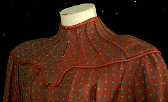 Description: This Klingon costume was worn by a pilgrim at the Klingon monastery on Boreth where the famous “Kahless the Unforgettable's” clone (Kevin Conway) told the story of how his batleth was created. The costume is a brown floor length robe with pleats in the front and back and vinyl trim. Hook and eyes clasp the cuffs into V-shapes as part of the design and there is a zip up the front. Costume comes complete with costume tag indicating wear by “Diane Lee”.