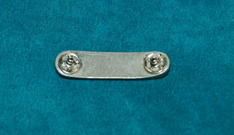 Description: A metal provisional rank pin made for ‘Maquis' crewmembers who integrated into the Starfleet crew of “USS Voyager” following their displacement into the Delta Quadrant during the pilot episode of Star Trek: Voyager, “Caretaker”. This pin indicates the provisional rank of ‘lieutenant’ due to its molded pair of stripes. A slightly curved metal pin with inset painted a shade of gold, and with black highlights around the inner edge, this style of pin showed up in various episodes of the series seven year run. The item features a pair of snaps on the back ready to be attached to receiving snaps on the yoke of a gray turtleneck undershirt corresponding to those worn by characters in the series. Due to the frequency of appearances of ‘lieutenant’ rank characters in the series a number of these will be available in the auction. The hue of coloration regarding the stripes, highlights, and inset may vary from the photograph. None of the available items have been in any way altered upon their location.