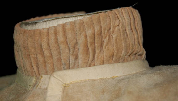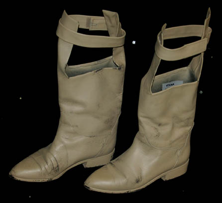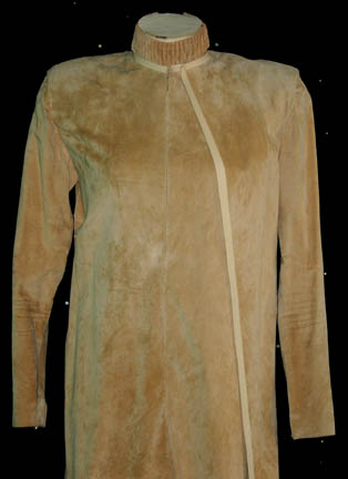 Description: The J'naii are an androgynous species who were featured in the Star Trek: The Next Generation episode “The Outcast”. This is a J’naii civilian costume that includes a suede tan color jumpsuit with leather trim. There is a flap on the front and zips at the wrists. A pair of tan distressed boots completes the outfit. Costume comes complete with costume tag.