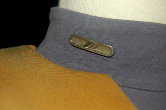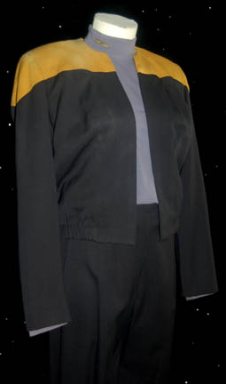 Description: “B'Elanna Torres” (Roxann Dawson), half-human and half-Klingon, was Chief Engineer onboard the U.S.S. Voyager during the Star Trek: Voyager series. This uniform is particularly interesting since the black Starfleet jacket with operations gold shoulders is a variation that wasn’t often seen during Star Trek. It has an elasticized waist and pleated wings in the back. There is distress created by the Star Trek costume department to the right shoulder and back of the jacket. The gray undershirt is long sleeved and comes with a snap on metal Marquis rank pin indicating her rank as Lieutenant. The accompanying black pants were worn by a stunt double rather than Dawson. Costume comes complete with costume tags.