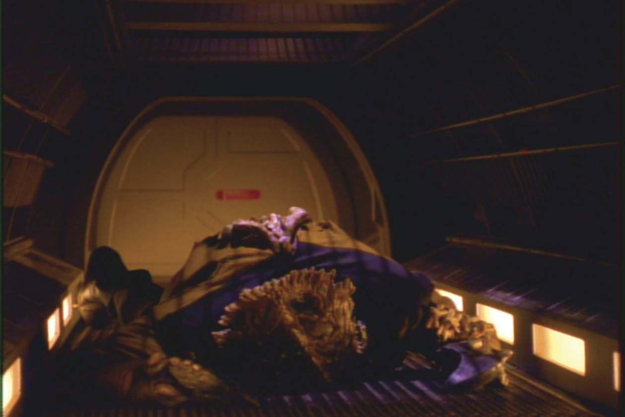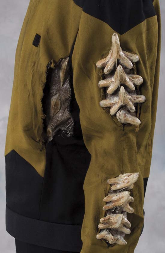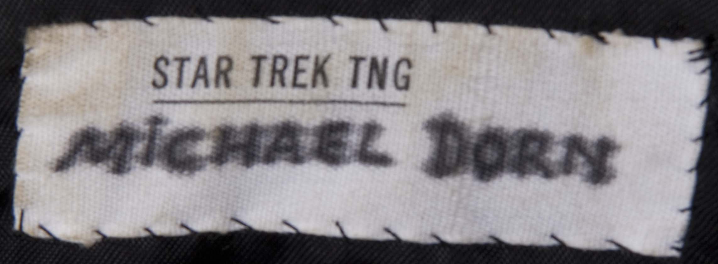 Description: (Paramount TV, 1984) Starfleet costume worn by Michael Dorn as "Worf " in the TV series Star Trek Next Generation. The trademark uniform is mustard yellow and black with yellow trim around the neck. It has a piece of Velcro on the front where the communicator badge would have been fixed and fastens up with a hidden zip at the back. The trousers have built in braces. "Worf" wears this ripped uniform in the series seven episode 'Genesis' where the entire crew of the Enterprise is affected by a synthetic T-Cell which has made the crew members resort to their most animal like instincts. The uniform has bone-like additions to the arms and side and a small protrusion on the thigh where "Worf " has changed into his animal self, the back of the uniform has a large rip in it where a large spine extension has "burst" through. The costume comes with the original costumer's label from the production, which details the character and the actors name, the scenes and the episode name.