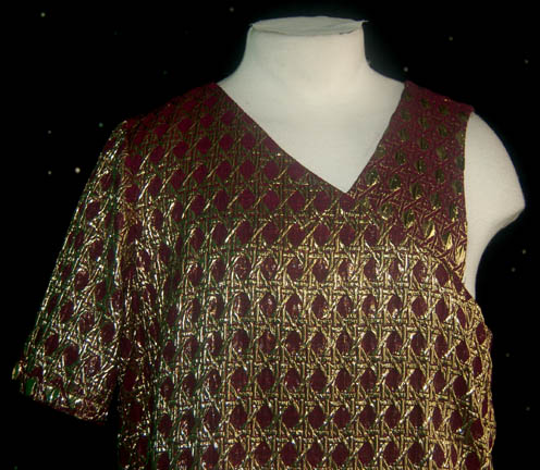 Description: These three beautiful shoulder drapes were worn by Ventaxian guards in the Star Trek: The Next Generation episode “Devil's Due”. One drape is green with a gold chevron pattern design over its entirety, the next is maroon with a gold interlacing pattern and the last is burnt sienna with a gold and black floral design. The last drape also comes with matching cuffs. Costumes come complete with costume tag.