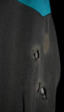 Description: A distressed sciences blue female Starfleet uniform jumpsuit made for various episodes of Star Trek: Voyager. This costume is black with blue shoulders and a gray long sleeved undershirt. Both items feature a degree of distress around the collar in the scope of burn marks, little holes, and tears. The same style of distress is evident on the left sleeve around the shoulder and minor holes are apparent in various places on the back of the uniform. A costumer's tag is inscribed ‘Voyager, female, distressed’.