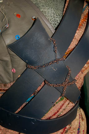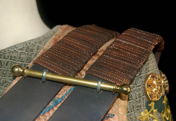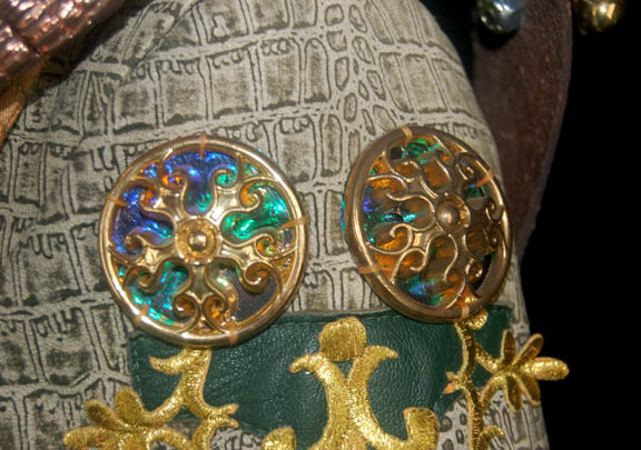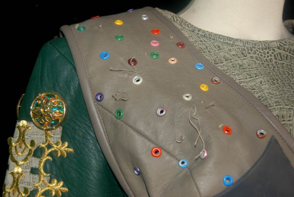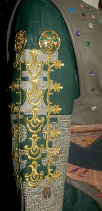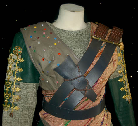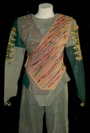 Description: The “USS Enterprise” responds to a signal sent by an enigmatic alien species who speak only in metaphor, the ‘Tamarians'. Unable to communicate with the aliens, “Captain Picard” (Patrick Stewart) is transported to the surface of a neutral world with “Captain Dathon” (Paul Winfield) of the alien ship where their mutual experiences on the planet lead to an open dialogue between their peoples. This ‘Tamarian’ costume is an example of their uniform, a pair of leather reptile patterned pants with a shirt that has matching sleeves and a shirt front with counter balancing green leather components. The costume comes with a multi-color striped vest with leather elements, beaded inset holes on the right breast where existed placements for metal and gem accent badges were placed (a selection of badges have been included), as evidenced by the remaining stitching. The uniform also features a leather belt and harness with sheath, metal accents and copper colored metal strips where the belt snaps together. The sleeves of the jacket feature ornate yellow embroidery with metal badges sewn on. All of this was featured in the Star Trek: The Next Generation episode “Darmok” as evidenced by a corresponding costumer’s tag.