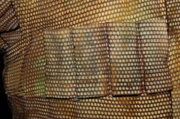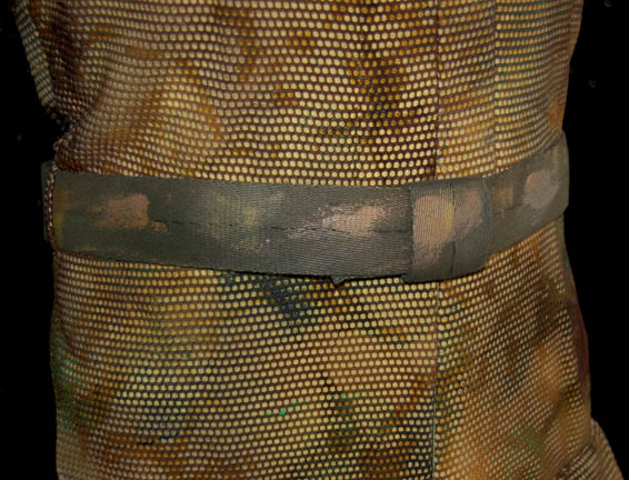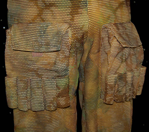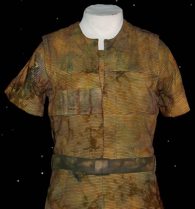 Description: An excellent set of costume combat fatigues featured in the Star Trek: Voyager episode “Nemesis”. Captured by an alien force at war with another species, “Chakotay” (Robert Beltran) is integrated into their fighting force while the “Voyager” crew searches for him. While getting to know the aliens, who are surprisingly human-like, he meets “Rafin” (Matt E. Levin), an inexperienced soldier who becomes his friend. This costume is the one worn by Matt Levin in the episode, a set of combat fatigues colored yellow with camouflage mesh covering the elements. The costume consists of a short sleeved shirt with matching sleeveless coveralls that feature Velcro sealing flap pockets on both thighs with equipment loops sewn on, belt loops for corresponding olive drab nylon clasp sealing belt, and accompanying sealed prop backpack painted to suit. The lot also comes with a distressed version of the costume featuring dried special effects ‘blood' and intermittent holes. Both costumes come with costumer’s tags indicating wear by ‘Matt E. Levin’ who also starred in the theatrical release of “Starship Troopers” the same year.