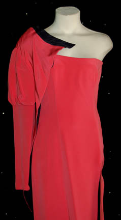 Description: Featured in the Star Trek: Voyager episode “Fortunate Son”, this off the shoulder pink dress has one puffed right sleeve and an additional fabric wing for decoration. A sexy thigh length split is up the left leg revealing the chic black lining. Costume comes complete with costume tag indicating wear by “Cheryl Eckelberry”.