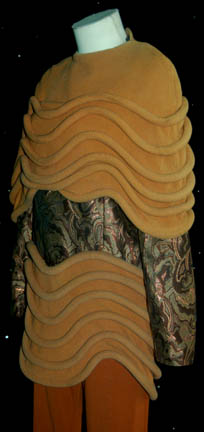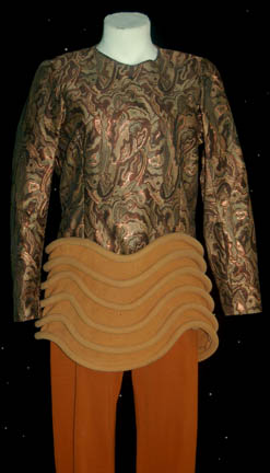 Description: This costume was featured in the Star Trek: Deep Space Nine episode “Q-Less”. It includes a patterned top using earth tone and copper colors with ribbed and wavy fabric piping around the bottom. A matching removable ribbed shoulder cape is worn over the top with terracotta color pants completing the look. Costume comes complete with costume tag.