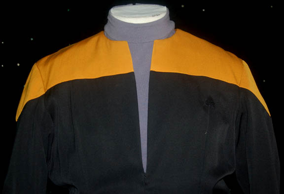 Description: “Harry Kim” (Garrett Wang) was the Operations Manager onboard the U.S.S. Voyager during the Star Trek: Voyager series. This is his Starfleet uniform including a black jumpsuit with operations gold shoulders and a small Velcro patch for a combadge (sold separately) to attach. The gray undergarment has built in shorts and a zip up the back. The sewn in tags read “Voyager – Garrett Wang”. Costume comes complete with costume tag.
