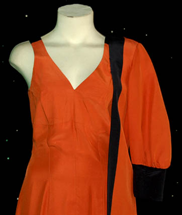 Description: Featured in the Star Trek: Voyager episode “Fortunate Son”, this off the shoulder orange dress has one puffed left sleeve and an additional fabric wing for decoration. A sexy thigh length split is up the right leg revealing the chic black lining. Costume comes complete with costume tag indicating wear by “Linda Li”.