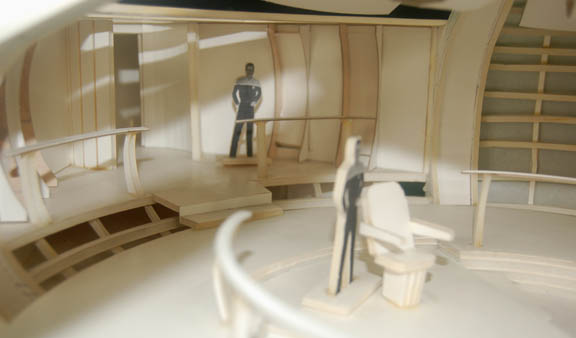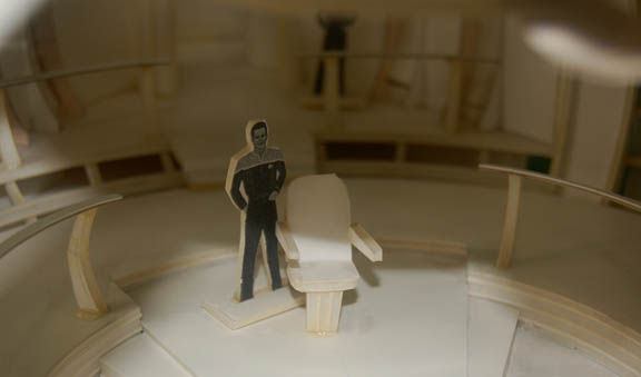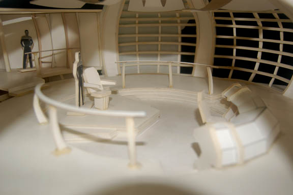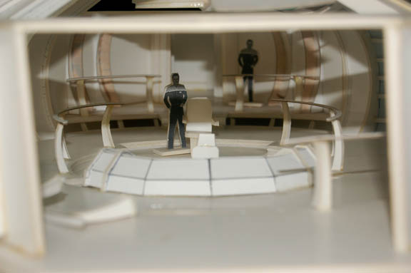 Description: Having accessed a communications array, the crew of “Voyager” received an encoded message indicating nearby coordinates. Upon arrival they discovered a starship presumably sent from Starfleet to carry them home employing experimental ‘quantum slipstream drive' technology much faster than warp speed. The ship was a dream come true and the bridge was light years more advanced than that of the intrepid “USS Voyager”. The item up for auction is a foam core model of the bridge of the “Dauntless”, the ship discovered in the episode “Hope and Fear”. The model features two secondary areas adjoining the main bridge rotunda, a three dimensional work of art eventually realized in a full scale, life sized set featured in the episode. The central bridge depicts an inset helm bank and chair at the fore, a centrally located command chair and a series of guard rails around them. The sides of the bridge walls are open to give viewers a full view of the interior, a section of the walls are present for the full effect. The front of the bridge is a step up to the main viewscreen (open for a view aft), and the rear reveals the exit to attached corridors. Two model miniature Starfleet characters are present for scale depicted in ‘First Contact-style’ uniforms, glued into place, one of the guard rails is unattached butt most likely to be placed at the fore of the bridge. The entire model is attached to a base showing some degree of damage due to time and storage conditions in that a corner is cracked but still attached due to the sturdiness of the top layer of the base, and a small corner under the identification plate on the base is broken away. The ID plate reads ‘Star Trek: Voyager, Episode #194, “Hope and Fear”, Dauntless Bridge” in caps and in the ‘Voyager-style’ font. The entire item measures approx. 22 X 36 X 7.5 inches.