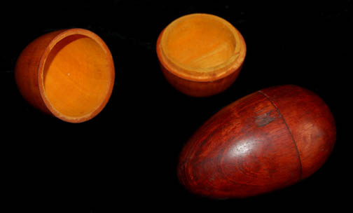 Description: A pair of finely crafted egg-shaped containers which split open and seal closed evenly. Both featured an internal cavity capable of holding small items and are painted individually with a reddish and yellowish varnish. Items were believed to have been featured various episodes of Star Trek: Voyager. They measure approx. 4 X 2.5 inches each.
