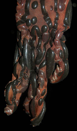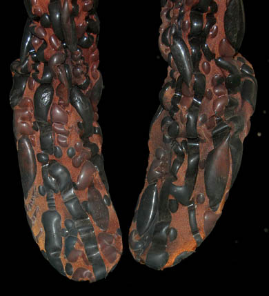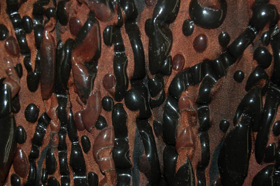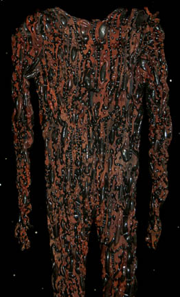 Description: An impressive form fitting jumpsuit made for the Star Trek: Voyager episode “Night” wherein the crew of “Voyager” have been traveling across an expanse of space devoid of light or life for two months until they come across a being which exists in total darkness, this “Night Alien” (Steve Dennis) whose species has been poisoned by another species who are using a wormhole in space to deposit toxic waste into ‘The Void'. This is the costume of the Night Alien, a bronze colored jumpsuit with blobs of opaque rubber spread throughout. The inside is lined with black nylon and comes with a white sleeveless undergarment. The costume also comes with a bag of extra matching fabric and the zipper in the back has broken in one place but clasps and snaps are still evident. The costumers tag reads ‘Night Alien, Steve Dennis’.