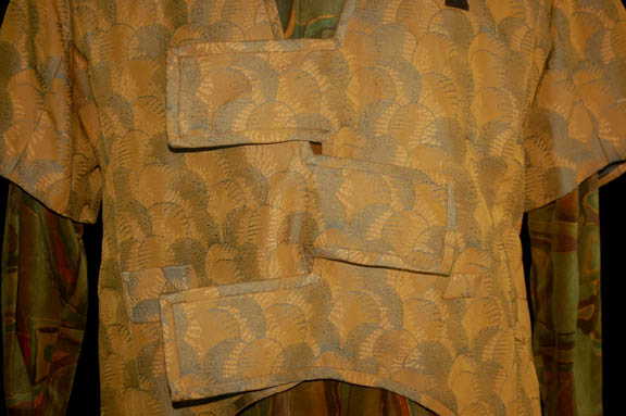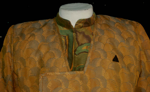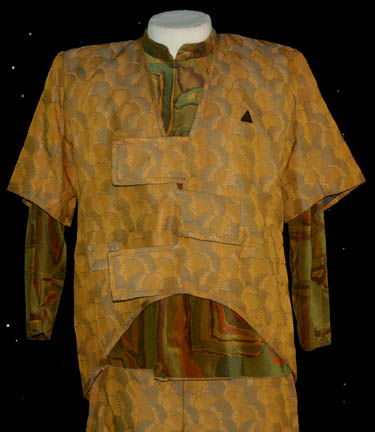 Description: This great costume was worn by “Neelix” (Ethan Phillips), a Talaxian who served as a chef onboard the U.S.S. Voyager during the Star Trek: Voyager series. This costume features a multicolored earth tone velvet shirt that zips up the front, a short sleeved green and yellow jacket that crosses over at the front and a pair of matching pants. All the items have a sewn in tag that reads “Voyager – Ethan Phillips”.