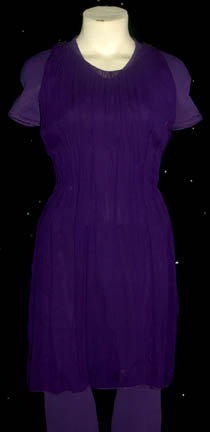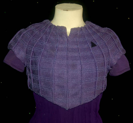 Description: “Kes” (Jennifer Lien) was from the Ocampa species who was rescued by “Neelix” (Ethan Phillips) and bought onboard the U.S.S. Voyager. She started off growing fruits and vegetables in a hydroponics garden in one of the cargo bays then later studied to become a nurse in sickbay. Her costume includes a blue short sleeved jumpsuit that has a crossed out tag that reads “Repair hole in butt” however there appears to be no damage to that area. A knee length shear blue top is worn over the jumpsuit with a crocheted cropped top worn as the last layer. A small Velcro patch for a combadge (sold separately) to attach is on the left chest. Costume comes complete with costume tag.