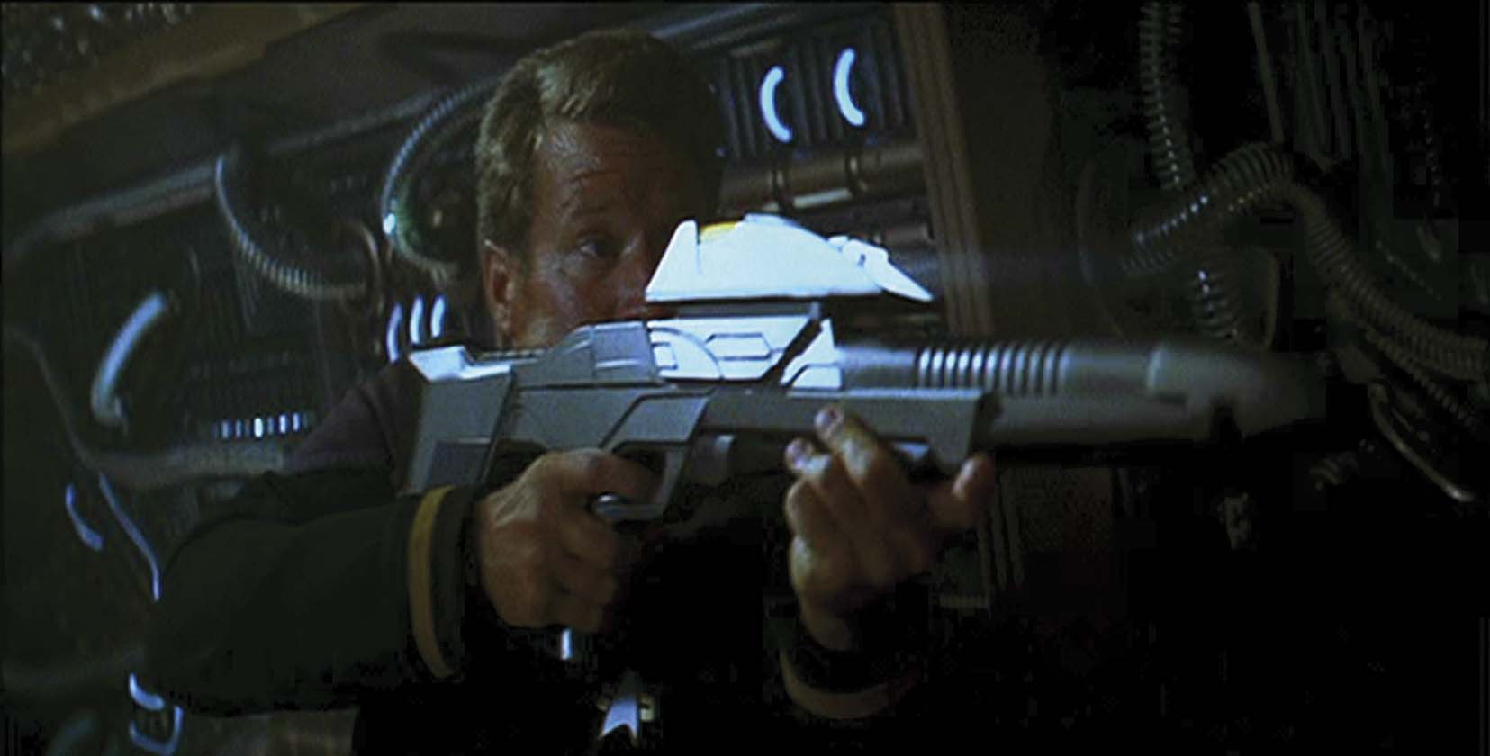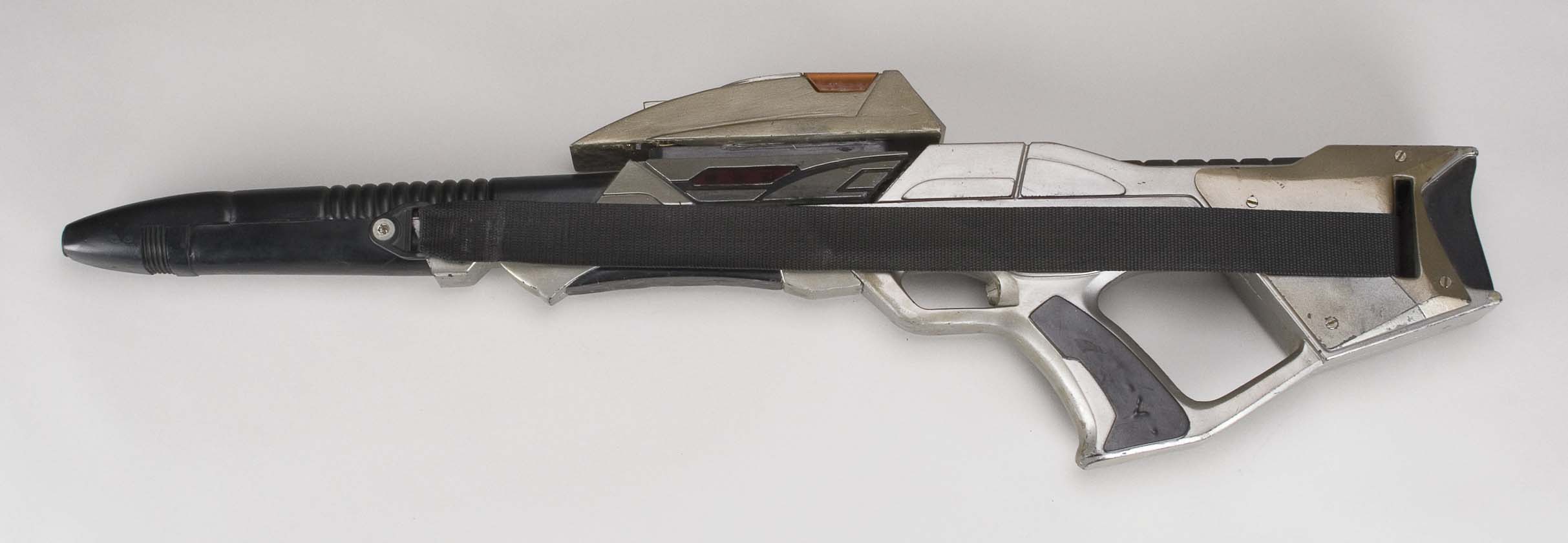 Description: (Paramount, 1996) One of three different versions of the phaser rifle used in the film, this model has a black barrel and is wired with an illuminating scope. In the film, the original model is modified in order to contend with the Borg's adaptation of Federation weapons. Constructed of black and gray-painted resin with a retractable strap. Measures 33 in. in length.