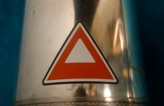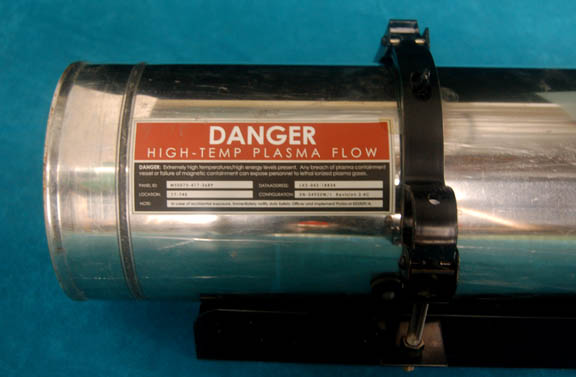 Description: A large sized polished metal ‘plasma container' featured as set dressing in various episodes of Star Trek: Enterprise in the ‘armory’ set. This item is part of a collection of similar containers which were affixed to a wall in the set, all able to be disconnected from their corresponding wall mount through the use of a latch which wraps around the container. This empty vessel features a trio of applications, one a ‘danger’ style triangle colored red and white like those seen in various places throughout the ship. The other two are matching rectangular inventory style applications featuring red warning labels reading ‘Danger, High-Temp Plasma Flow’ with instructions about how to handle ‘exposure’, and a warning about the ‘dangerous’ elements held within. Even though the container never held anything that we know of it maintains a top mounted screw on cap which when removed reveals a closed opening, covered over with black grip tape. Item measures approx. 22.5 X 9 X 9 inches when connected. Affix one to your armory wall today!