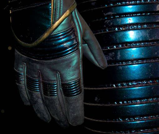 Description: The Xindi-reptilians are an aggressive humanoid race of the Xindi species. Featured for the first time in the Star Trek: Enterprise series, the Xindi-reptilians were keenly focused on destroying planet Earth, going so far as to try and create a Xindi bioweapon to completely annihilate humanity. This Xindi costume started out as a Reman costume in Star Trek X: Nemesis but was modified and reused for season three of Star Trek: Enterprise for the Reptilian Xindi. The pants are made of metallic purple vinyl with padded sections on the side of each leg and the shins, surrounded with gold cord added for definition. The top section is a black bib with a zip down the front. The jacket is made of metallic purple vinyl with quilted padding across the shoulders, back, waist and arms and around the collar. All padded sections are defined by gold cord. It zips up the front and has had the Reman “X” removed from the back of the neck to make it ‘Xindi'. The caged frame worn over the suit is distinctly Xindi and is made of plastic black tubes spray-painted silver and gold for a metallic finish. The tubes are attached to an imitation leather harness that has gold piping and a gold and black Egyptian hieroglyphic motif over its entirety. The cage does up at the front with three metal twist clips. The costume is complete with matching boots and gloves. All items indicate wear by reoccurring Star Trek guest actor Louis Ortiz. Also included is a black vest and jumpsuit designed for wear underneath the Xindi costume.