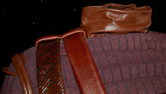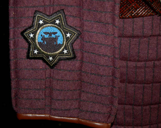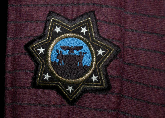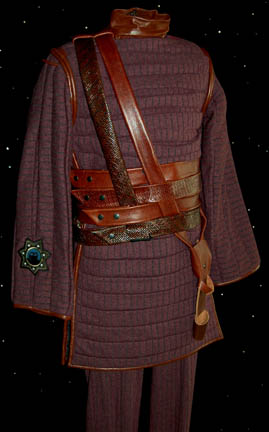 Description: The Tandarans are a humanoid race at war with the Suliban Cabal during the Enterprise series and were featured in the Enterprise episode “Detained”. This is a Tandaran costume that includes a long mauve woolen top with upwards facing pleats and padding. There is brown piping around the shoulders and down each side with slits at the bottom. On the right sleeve is a Tandaran seven-pointed star emblem. Worn underneath is a black padded dickie with a brown faux leather collar. The accompanying pants are made of the same mauve material with black suspenders. An impressive harness completes the costume, made of different patterns of brown leather interlaced and with a built in gun holster. Costume comes complete with costume tag.