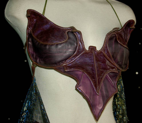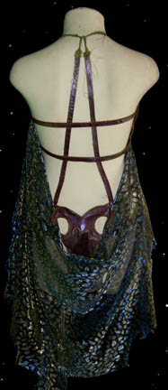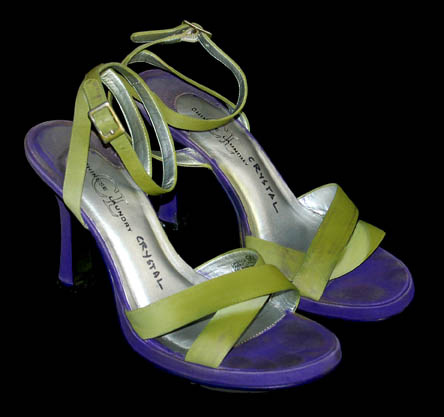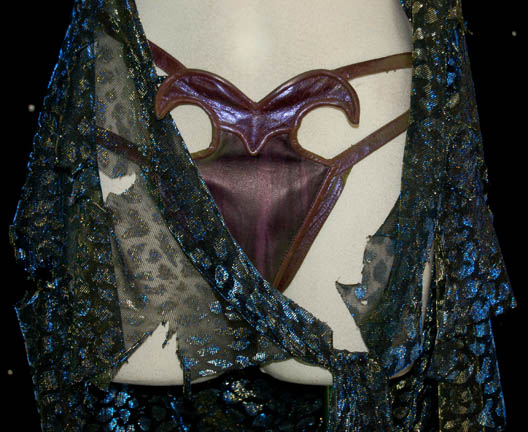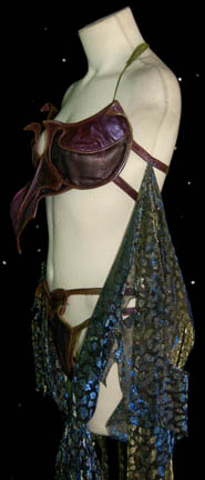Description: The Orions are a humanoid species with distinct green skin from the Orion planet. This sexy costume was worn by the Orion slave girl “D'Nesh” (Crystal Allen) in the Star Trek: Enterprise episode “Bound”. She was given by the Orion “Harrad-Sar” (William Lucking) to “Captain Archer” (Scott Bakula) as a gift in celebration of the Orion Sydicate trade agreement. Her costume is a two piece purple vinyl bikini held together with hook and eye fasteners and snaps. The straps are both vinyl and green mesh that is far sturdier than it appears. A shimmering fabric wrap of black and gold/blue patterns drapes around the waist. Due to the nature of the Orion appearance, there is green makeup over parts of the costume. The accompanying four inch heels (9M) are purple with Orion green straps. Costume comes complete with costume tag indicating wear by “Crystal Allen”.