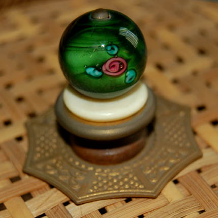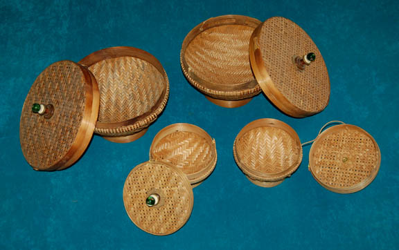 Description: These detailed baskets were used in the filming of Star Trek episodic television. Each one has been intricately woven with chevron lattice lids and sides. The lids are attached by thin rope to the bodies of the baskets and each has a beautiful metal and glass knob on the top. The large baskets each measure approx. 9 x 10 inches diameter and the small baskets each measure approx. 6 ¼ x 6 ¼ inches.