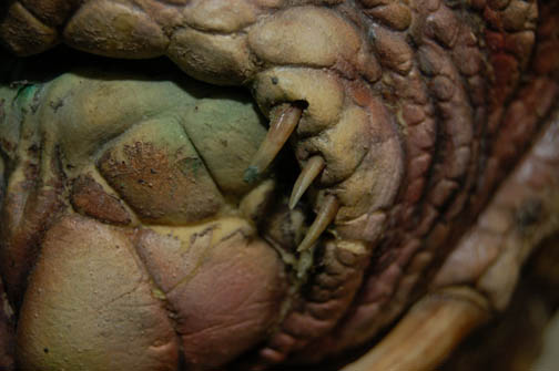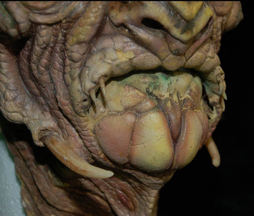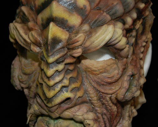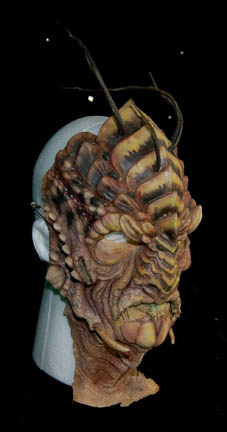 Description: The Xindi-reptilians are an aggressive humanoid race of the Xindi species. Featured for the first time in the Star Trek: Enterprise series, the Xindi-reptilians were keenly focused on destroying planet Earth, going so far as to try and create a Xindi bioweapon to completely annihilate humanity. Their facial structure is distinctly reptilian with scaly ridges and prominent brows. Small tusks protrude from around the mouth and black spikes protrude from their heads. This delicate latex prosthetic was used to create the Xindi-reptilian appearance and is airbrushed extensively to create skin texture, shadows and definition. The tusks and spikes are made of resin.
