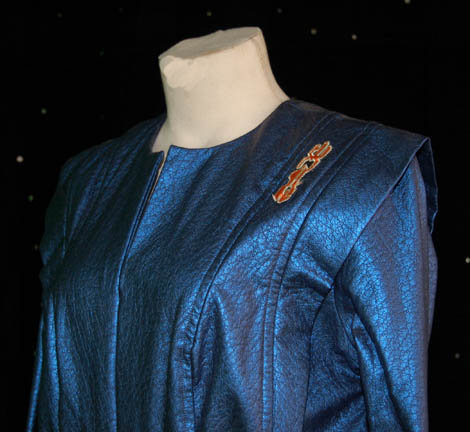 Description: Captured by a massive industrial consortium and brainwashed into believing that they have been part of the employees of this company forever, the crew of “Voyager” wore jumpsuits like this one in the episodes “Workforce, Parts I and II” of Star Trek: Voyager. A shiny blue jumpsuit with a matching belt, detachable shoulder pads, a zip up the front, and an orange sewn in division patch on the left shoulder front depicting ‘Quarren' character letters. Made by ‘MTO Little, Los Angeles’ the costumer’s tag indicates use in the episode “Workforce”.