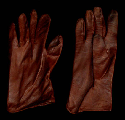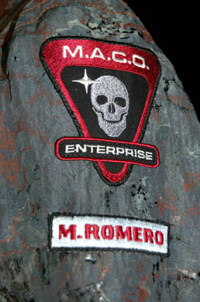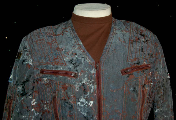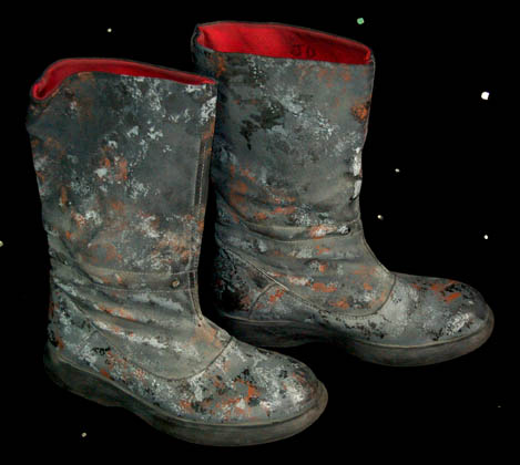 Description: The “evil Mirror Universe” of Star Trek is a place where our heroes are duplicated, though their personalities are vastly different due to their changed circumstances. The Federation has been replaced by a Terran Empire that rules by force and conquest instead of governing by diplomacy and democracy. Changes in the chain of command frequently occur and it is during that time that there is no one better suited to defend the status quo, or defeat it, than the MACOs (Military Assault Command Operations). They are not the “redshirts” of the classic Star Trek, nor are they part of “Enterprise's” pre-Federation Starfleet, but a group of highly dedicated soldiers that are part of the Terran Empire’s assault forces. They have a unique uniform and this item is one of them. It is made up of a brown undershirt, covered by a gray nylon uniform jacket that zips up the front; similar nylon pants with stirrups and a brown leather belt with metal belt buckle. Both jacket and pants are detailed with brown thread and the costume is loaded with zippered pockets. The sleeves on the uniform jacket are decorated; the left one with the MACO emblem patch featuring a cracked skull and the name of the soldier wearing the uniform, this one being “M. Romero”, and the right sleeve featuring the red bar with the classic Starfleet arrowhead with yellow and blue bars on opposing ends, and the rank of the soldier, this one being a ‘private’. The uniform also includes a pair of reddish-brown gloves and gray boots made from vinyl with canvas tops. The overall color of the entire lot (barring the gloves and undershirt) is gray with uniquely mottled white, black, and brown paint smudges thru ought to give it a “camouflaged” appearance. The sewn in Enterprise tag indicates use by various actors and the costume comes with a costumer’s tag.