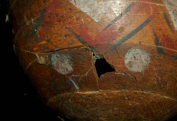 Description: This interesting drum was used during the filming of Star Trek episodic television. The bowl shaped base is fashioned from wood that has been hand painted with various chevron patterns and dots. There is a hole near the bottom. An animal hide is stretched across the base to create the drums surface. Measures approx. 8 ¼ x 14 ¼ inches.