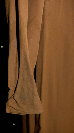 Description: Captured by a massive industrial consortium and brainwashed into believing that they have been part of the employees of this company forever, the crew of “Voyager” wore jumpsuits like this one in the episodes “Workforce, Parts I and II” of Star Trek: Voyager. This brown robe was worn by a “patient” and criss-crosses at the front and snaps into place on each side. There are pleats around the shoulder for detail. Costume comes complete with costume tag.