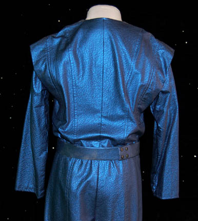 Description: Captured by a massive industrial consortium and brainwashed into believing that they have been part of the employees of this company forever, the crew of “Voyager” wore jumpsuits like this one in the episodes “Workforce, Parts I and II” of Star Trek: Voyager. A shiny blue jumpsuit with a matching belt, detachable shoulder pads, a zip up the front, and an orange sewn in division patch on the left shoulder front depicting ‘Quarren' character letters. Made by ‘MTO Little, Los Angeles’ the costumer’s tag indicates use in the episode “Workforce”.
