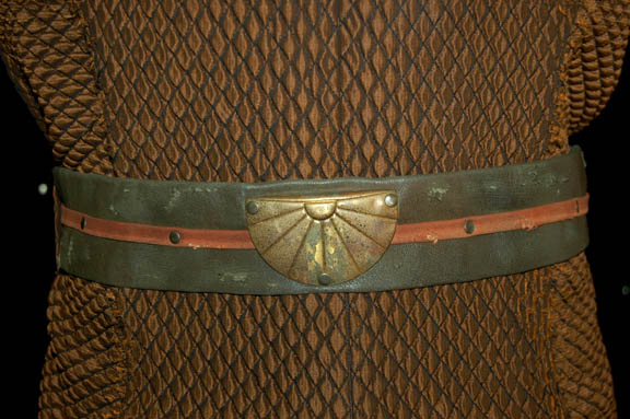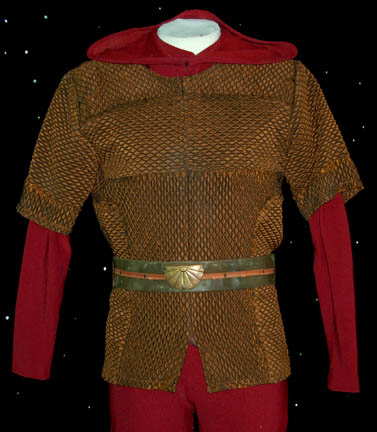 Description: A costume made for actors portraying ‘Suliban' prisoners in a Tandaran detention camp in the Star Trek: Enterprise episode “Detained”. The costume is comprised of a hooded red jumpsuit and a diamond patterned tunic with belt loops for the corresponding leather belt. The jumpsuit features a ‘MUTO Little, Los Angeles’ tag and a costumer’s tag indicates wear by ‘Trey King’.