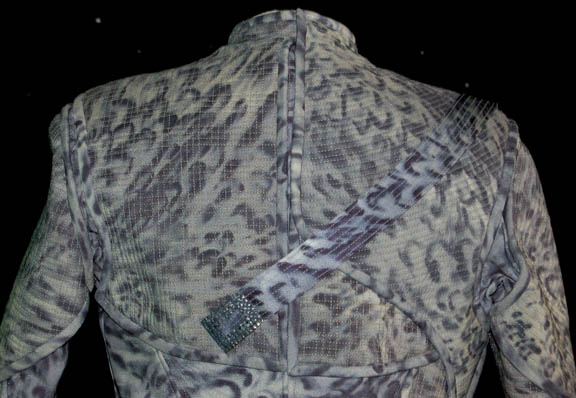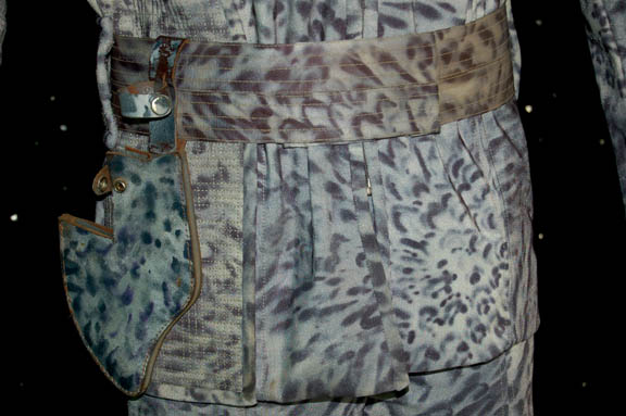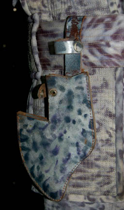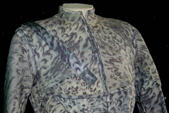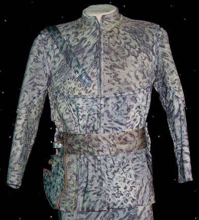 Description: “Shiraht” (Eric Pierpoint) was an “Eska” hunter from the planet Dakala encountered by “Captain Archer” (Scott Bakula) and the NX-01 Enterprise crew in the Star Trek: Enterprise episode “Rogue Planet”. Best known for their hunting prowess, the Eska hunted the “Wraiths”; shapeshifting beings on the same planet. This is his costume that includes a gray mottled effect Lycra shirt with a zip up the back and a pleat down the front. The pants are made of the same fabric with additional decorated padding at the knees. The matching jacket has extensive decorative stitching to the chest, shoulders and right side of the body. It zips up the front and there is a strip running from the right breast to the back, each end has a metal accent attached. A belt, knife holster and metal bladed knife complete the outfit. The blade is curved and features a jagged back with serrations, and a pattern of holes through the blade itself. The grip is red furnished wood attached to the metal of the blade; there is a hole in the metal for the forefinger of any ‘humanoid'. The item also comes with a leather sheath designed to match the unique camo pattern of the 'Eska' hunting uniforms in that it is white with black splotches. The sheath features two snaps that hold the knife in place and a belt loop. The blade measures approx. 3.75 X 7.5 and the overall length is 12.5 from tip to pommel. The grip itself is a meaty .75 inches. The prop metal blade is not sharpened but it is made to look sharp. Costume comes complete with a costume tag.