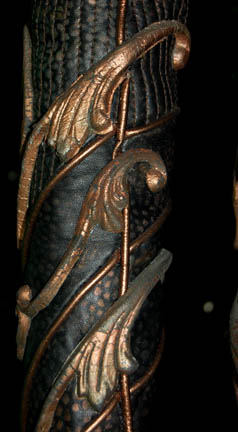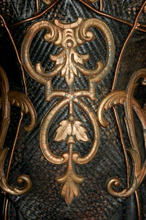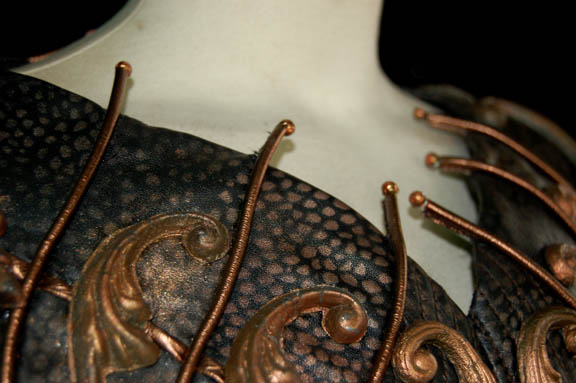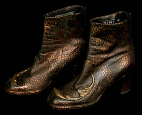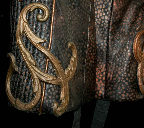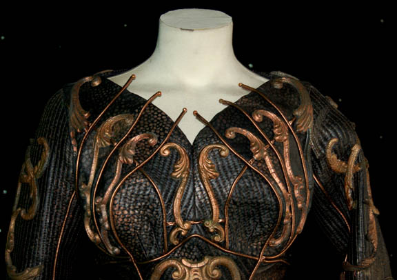 Description: A two piece black costume made from synthetic materials with gold colored molded foam accents applied throughout and painted on details. The costume is made up of jumpsuit pants with suspenders and a matching costume top with long sleeves, and a pair of matching heel boots by ‘Nine West'. The costumer’s tag indicates wear by ‘Jennifer Anderson’ during episode ‘#76’ equivocating to “Zero Hour”, the climatic episode of the third season.