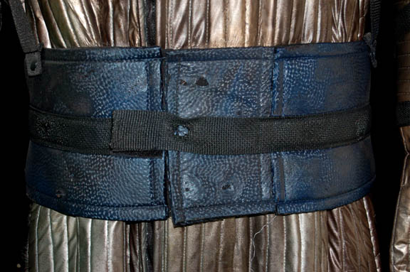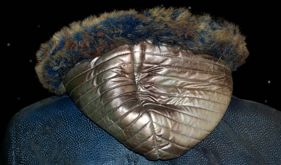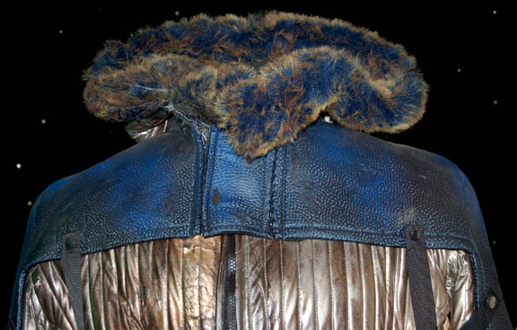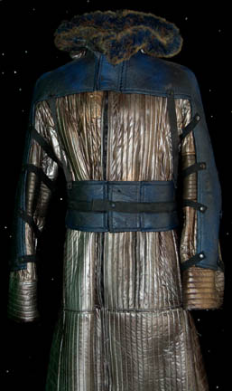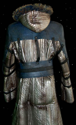 Description: A large costume featured in the Star Trek: Enterprise episode “The Seventh” in which an away team from “Enterprise” seeks to capture a Vulcan outlaw in a bar on a nearby world. The bar is populated by all manner of aliens, one who happens to be enormous. This costume is that of a very tall alien who stepped into “Captain Archer's” (Scott Bakula) way while he attempted to capture the fugitive. The costume is made from large silver colored thermal pants on suspenders with a massive gold colored overcoat and belt with multiple straps and a fur lined hood. The costumer’s tag reads ‘Enterprise #033 “The Seventh”, Huge Alien, Vincent Hammond’.