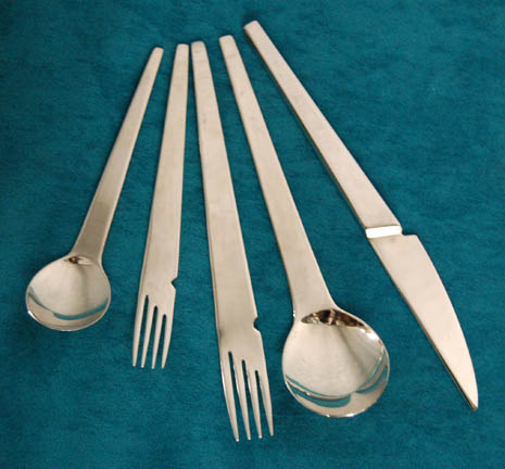 Description: Enjoy a feast with this futuristic cutlery set used during the filming of Star Trek episodic television. The set accommodates four people and includes 4 knifes, 4 large forks, 4 small forks, 4 large spoons and 4 small spoons. Two of the small spoons and two of the small forks have a matt finish while the rest of the set is shiny.